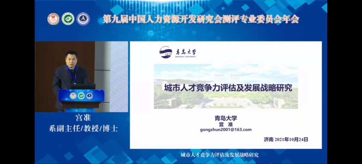 10月23-24日,第九届中国人力资源开发研究会测评专业委员会年会在济南山东青年政治学院举行。电竞菠菜 宫准教授主持大会人才测评实践分论坛并在大会做主题报告。与研究生张美倩、赵方圆、王辰、原颖慧合作的论文《人才竞争力评估及发展战略研究——以青岛市为例》获评年会优秀论文。