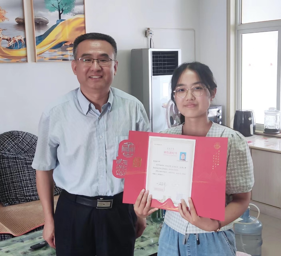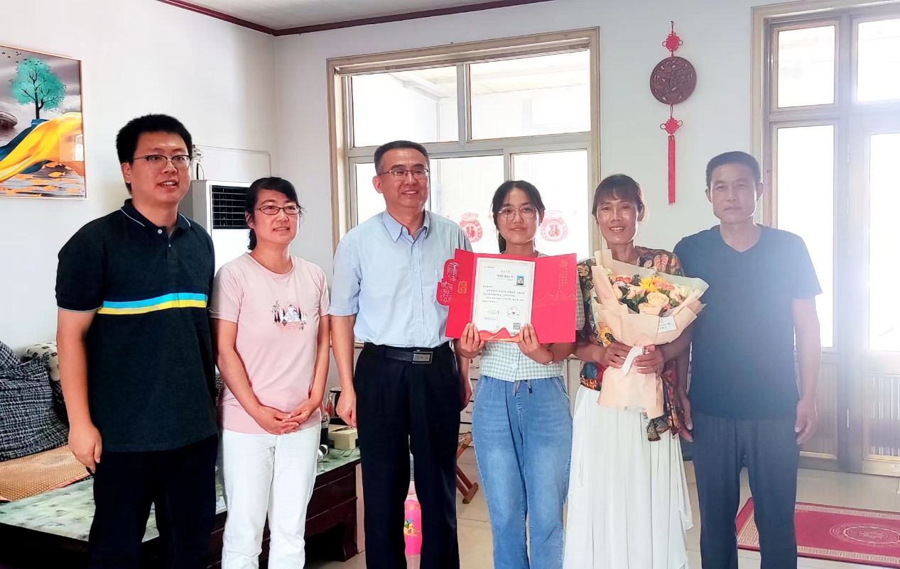 8月3日上午,电竞菠菜 党委书记尹增刚一行来到平度市南村镇东王府庄村,将校长夏东伟教授亲笔签发的录取通知书送到2022级学前教育专业公费师范生蒋雯丽同学手中。这是我校送达的2022年第一份本科生录取通知书。学院领导变身“邮差”,送去的不仅仅是录取通知书,还有学校学院对莘莘学子的殷切关怀和期待,为考取我校的新同学上了一堂生动的“新生第一课”。
