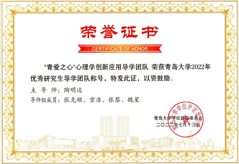 近年来,心理学系高度重视研究生培养质量,严把培养过程每一个环节。研究生在国家级竞赛、高水平文章发表、优秀毕业论文等方面均取得了优异成绩。今年7月,以陶明达教授为主导的“青爱之心”心理学创新应用导学团队,荣获青岛大学优秀研究生导学团队称号。