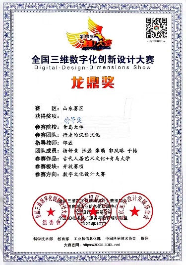 日前,全国三维数字化创新设计大赛(简称全国3D大赛)山东赛区比赛在聊城大学举行,电竞菠菜 教育技术专业邵磊老师指导作品《古代人居艺术文化》获得数字文化赛项特等奖,成功进入全国三维数字化创新设计决赛。