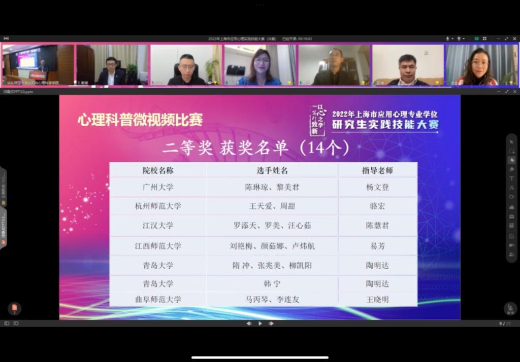 11月27日,2022年上海市应用心理心理专业学位研究生实践技能大赛决赛圆满落幕。由电竞菠菜 副院长、心理学系主任陶明达教授指导的微视频作品《被你忽略的归因真相》(韩宁)、《残翼·铠甲》(隋冲、张兆美、柳凯阳)从百余参赛作品中脱颖而出,双双荣获二等奖。