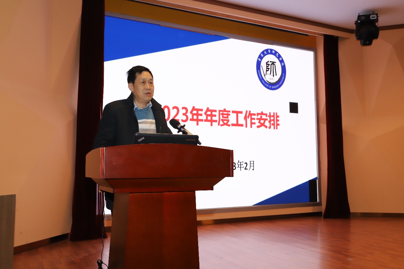 院长孙百才总结了2022年度学院指标完成情况,分析了学院基础与发展方向,着重从人才培养、科学研究、人才建设、学科建设等四个方面做了部署。要求学院的教学、科研、培训、管理等四支队伍各司其职又协同一致,提升学院的教学、科研、社会服务水准。