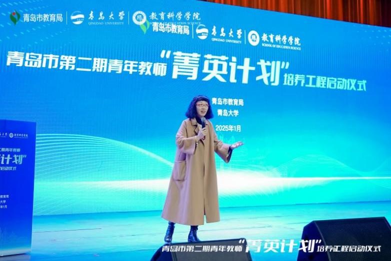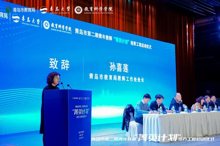 青岛市教育局教师工作处处长孙喜莲在讲话中高度赞扬了青岛大学的师资力量与教育成果,她希望青年教师们珍惜机遇,快速成长,携手共进,为教育强国梦添砖加瓦。
